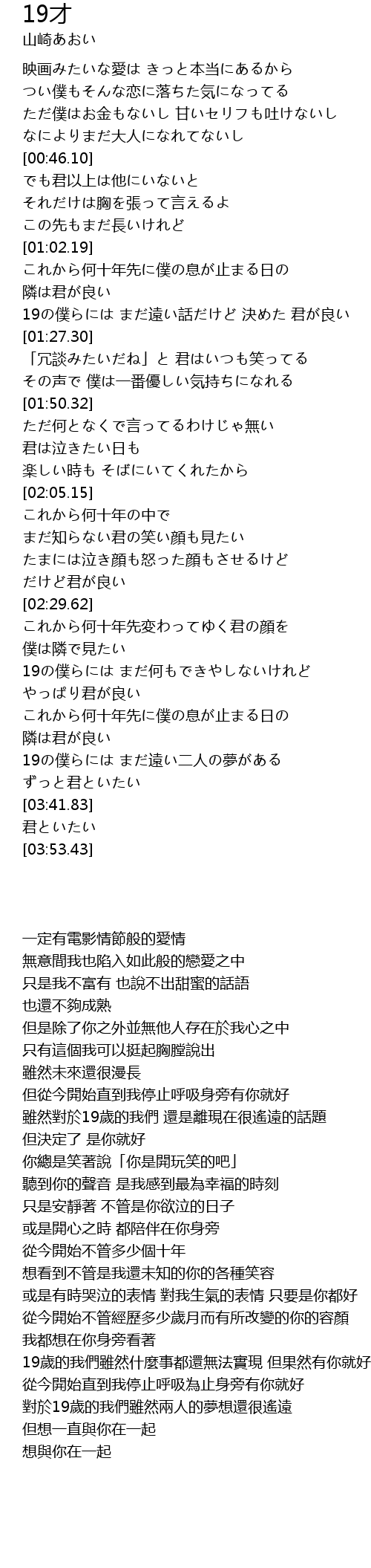 | [03:27.40] | 對於19歲的我們雖然兩人的夢想還很遙遠 但想一直與你在一起 |