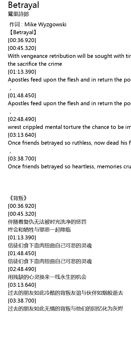 | [03:26.380] | Once friends betrayed so ruthless, now dead his friend and friendship , |