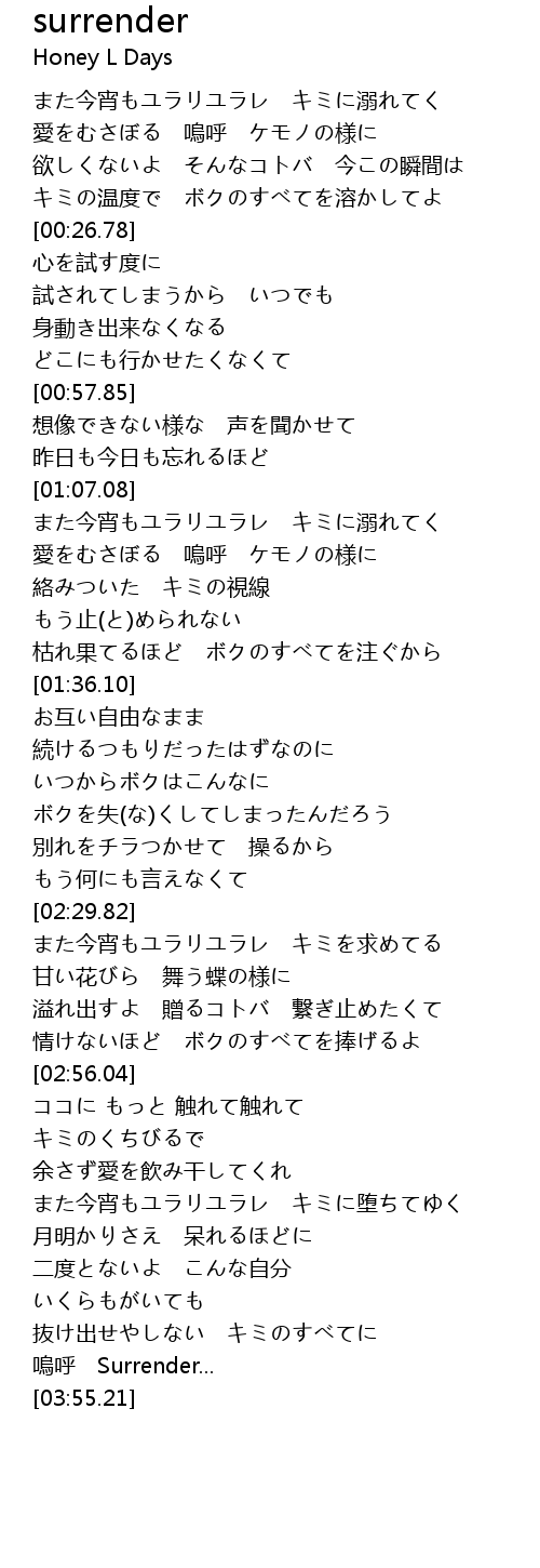| [00:00.84] | また今宵もユラリユラレ キミに溺れてく |