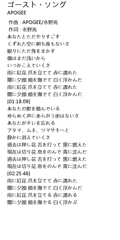 | [03:30.17] | 闇に夕顔 頬を撫でて 白く浮かんだ |