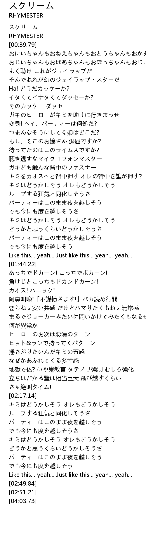 | [02:12.97] | 立ちはだかる壁は相当巨大 飛び越すくらい さぁ絶叫タイム! |