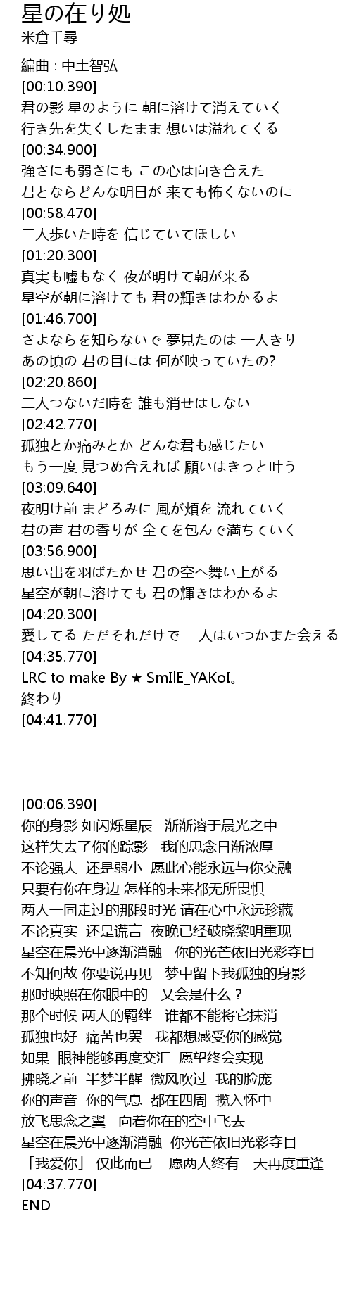 | [04:09.410] | 星空が朝に溶けても 君の輝きはわかるよ |