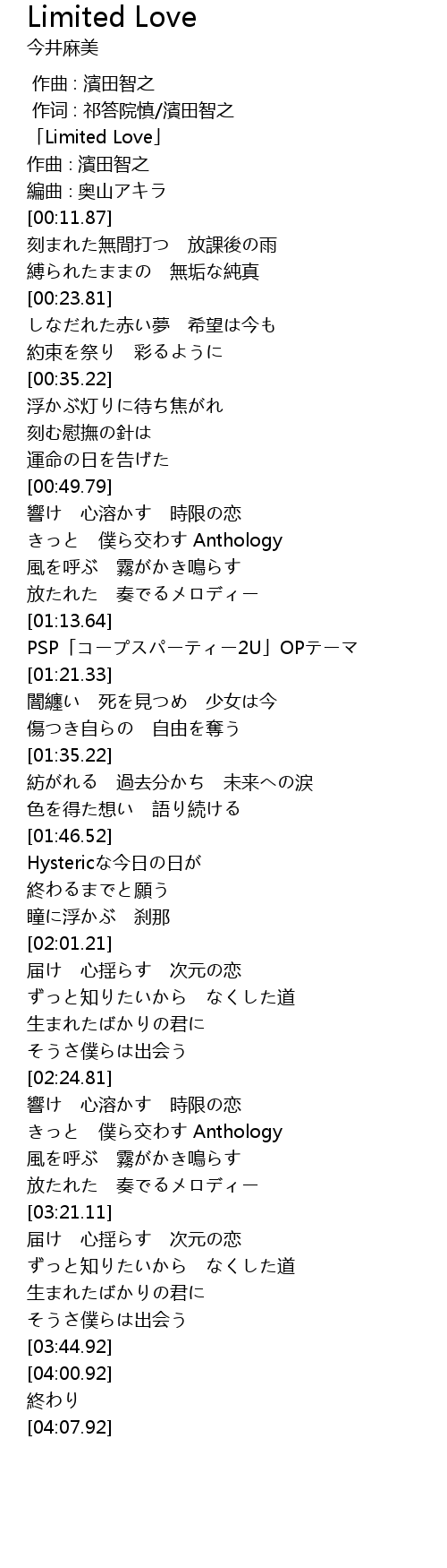 | [02:58.92] | 響け 心溶かす 時限の恋 |