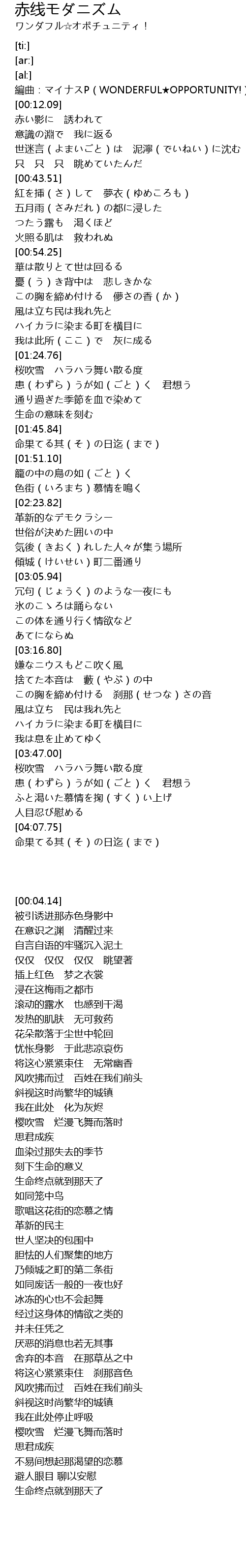 | [00:04.14] | 編曲:マイナスP(WONDERFUL★OPPORTUNITY!) |