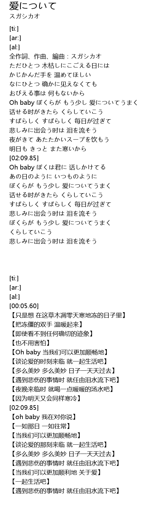 | [00:05.60] | 全作詞、作曲、編曲:スガシカオ |