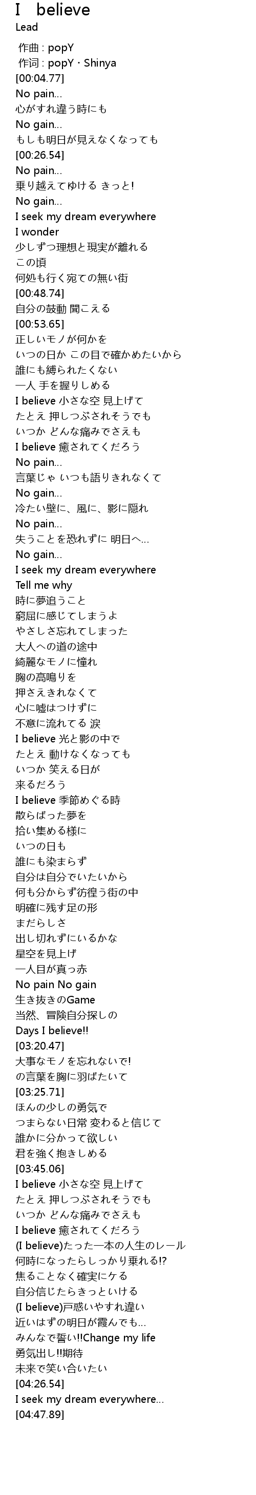 | [03:47.71] | I believe 小さな空 見上げて |