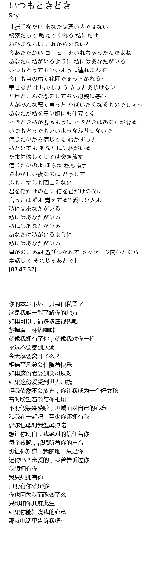 | [01:45.18] | いつもどうでもいいようなふりしないで 信じたいから信じてる 心がずっと |