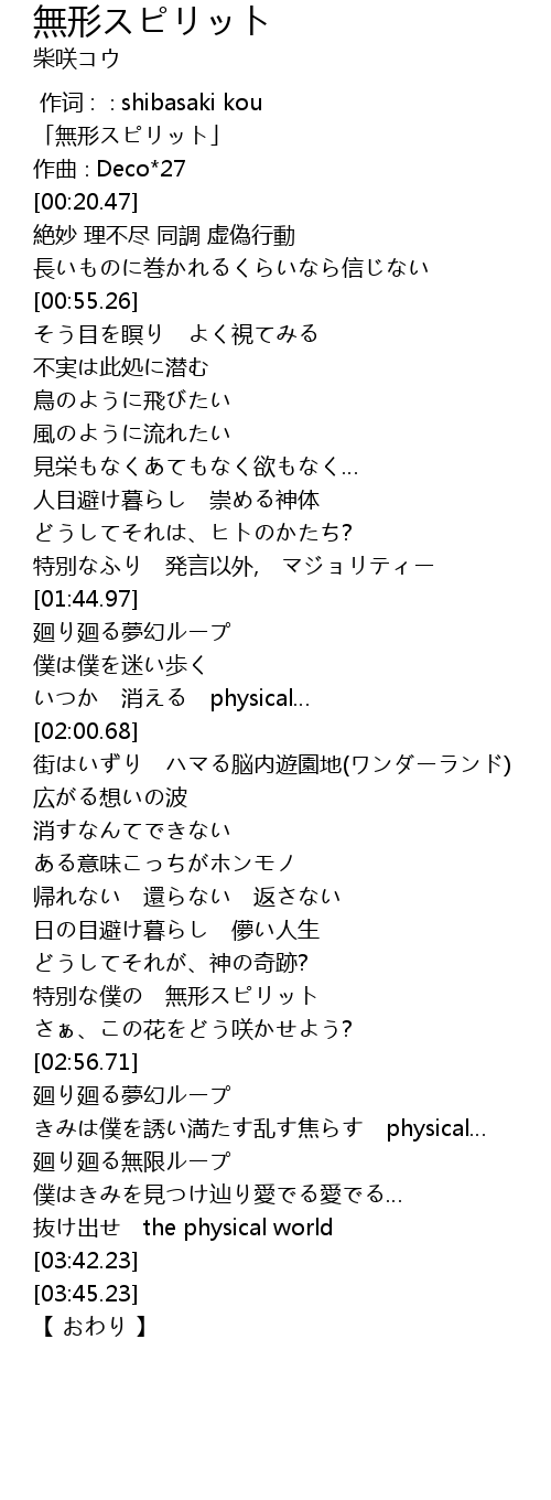 | [00:22.47] | 絶妙 理不尽 同調 虚偽行動 |