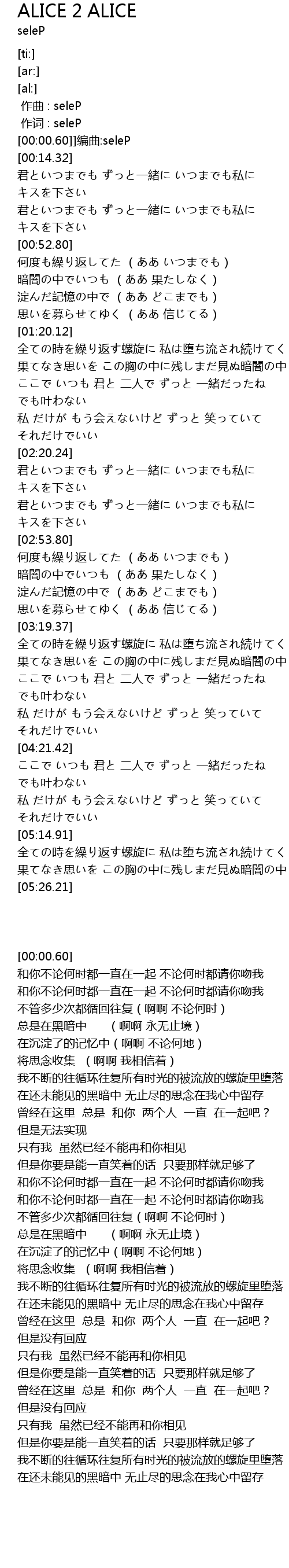 | [00:41.24] | 君といつまでも ずっと一緒に いつまでも私に キスを下さい |