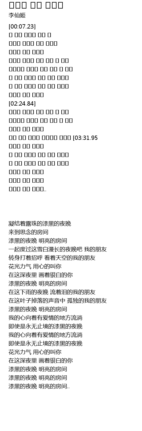 | [03:18.69]나의 마음 흐른다 사랑있는 곳으로 [03:31.95] | 끝없이 끝없이 까만 밤에도 |