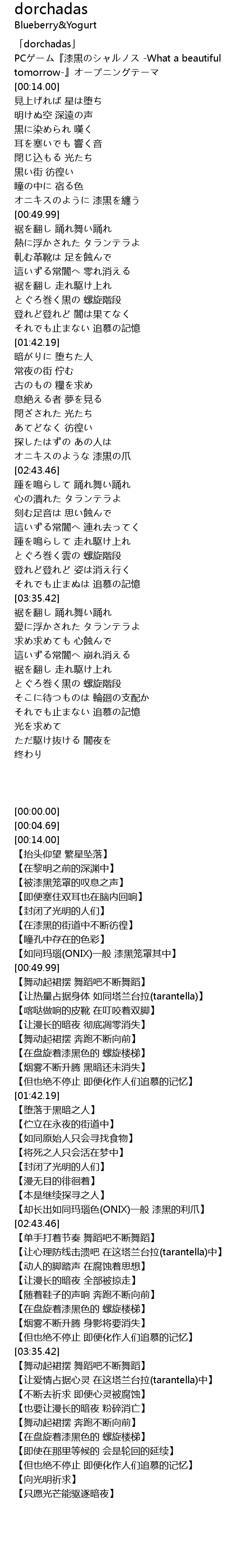 | [00:04.69] | PCゲーム『漆黒のシャルノス -What a beautiful tomorrow-』オープニングテーマ |