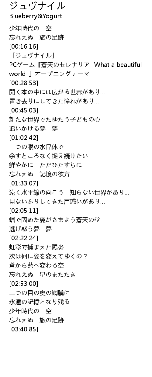 | [00:21.15] | PCゲーム『蒼天のセレナリア -What a beautiful world-』オープニングテーマ |