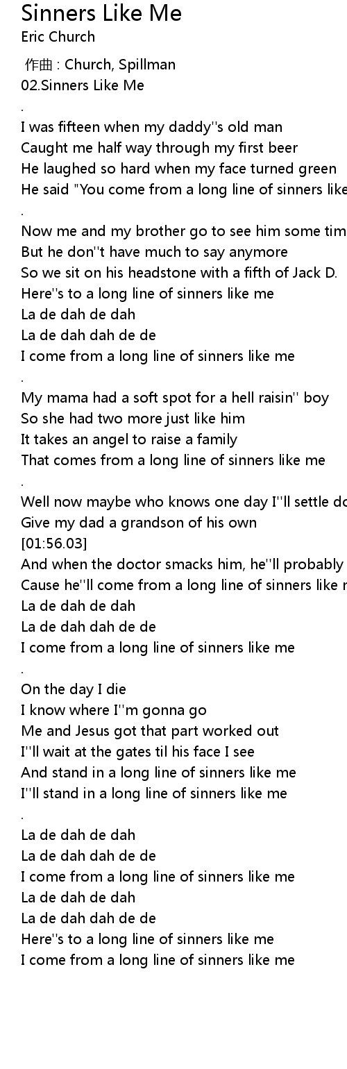 | [02:03.58] | Cause he''ll come from a long line of sinners like me |