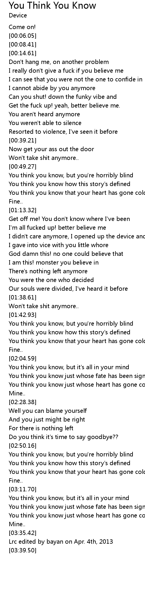 | [00:50.28] | You think you know, but you're horribly blind |