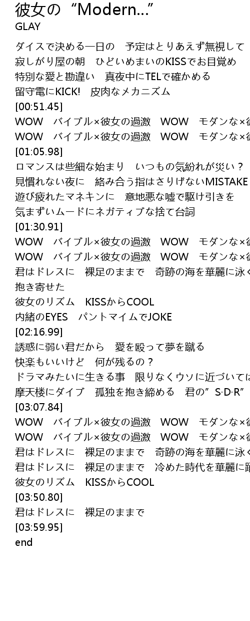 | [00:53.44] | WOW バイブル×彼女の過激 WOW モダンな×彼女の刺激 |