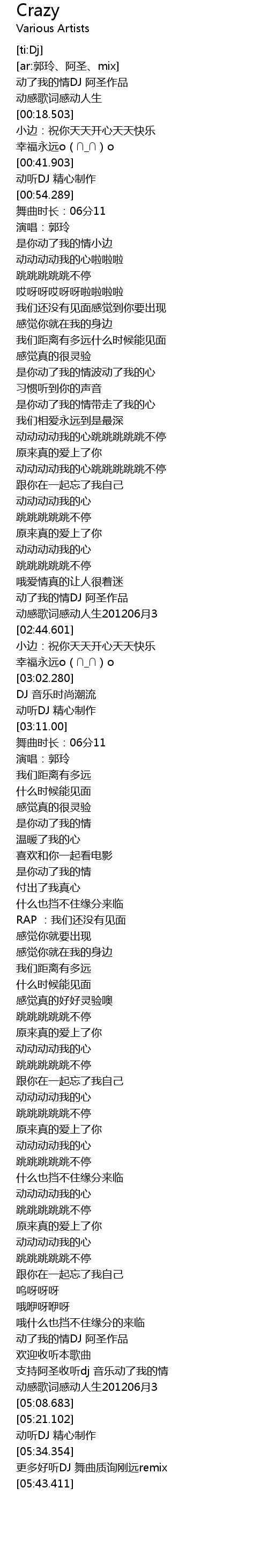 | [05:37.251] | geng duo hao ting DJ wu qu zhi xun gang yuan remix |