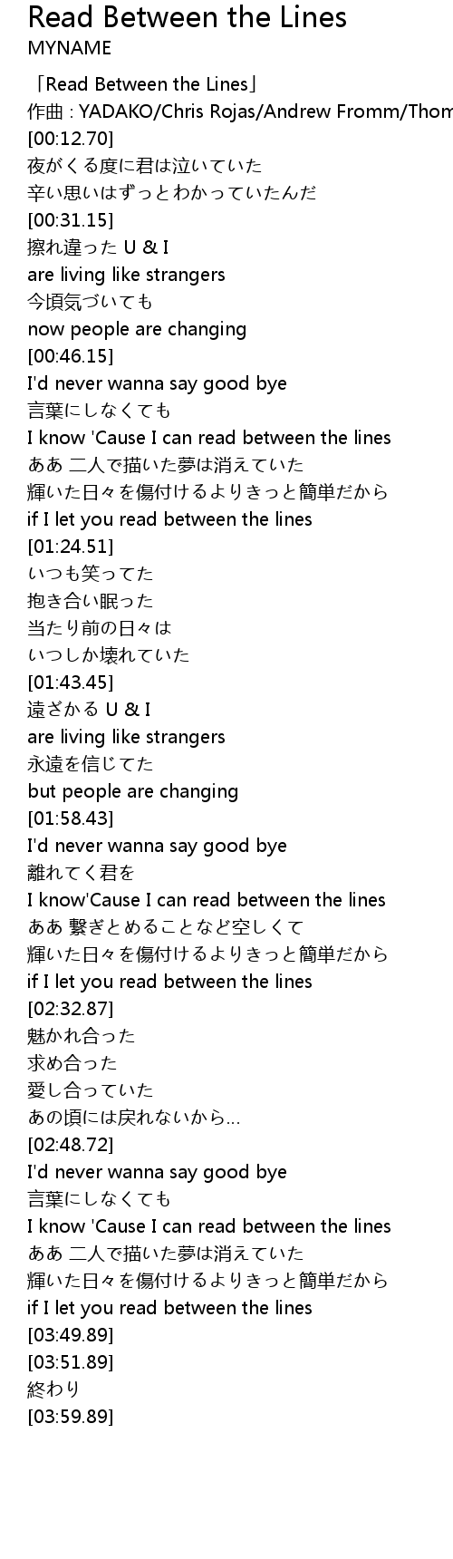 | [03:09.91] | I know 'Cause I can read between the lines |