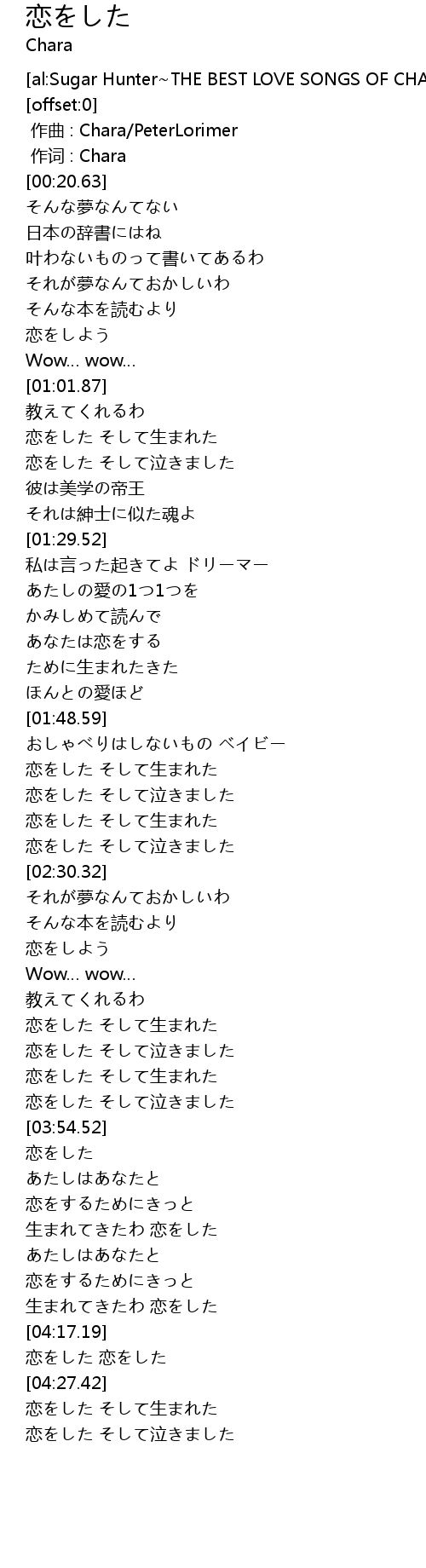 | [00:00.00] | 作曲 : Chara/PeterLorimer |