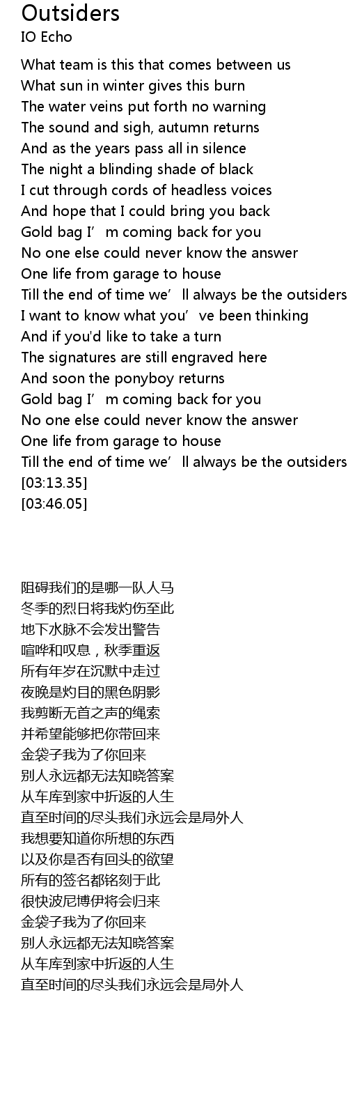 | [01:37.63] | Till the end of time we' ll always be the outsiders |