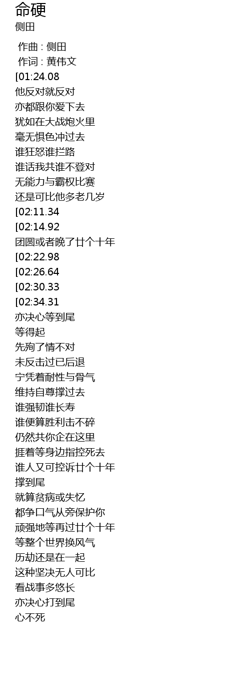 | [00:12.00][01:24.08][03:24.48] | 侧田-命硬(粤) |