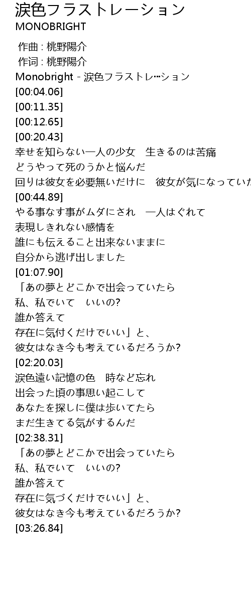 | [00:01.12] | Monobright - 涙色フラストレ┅ション |