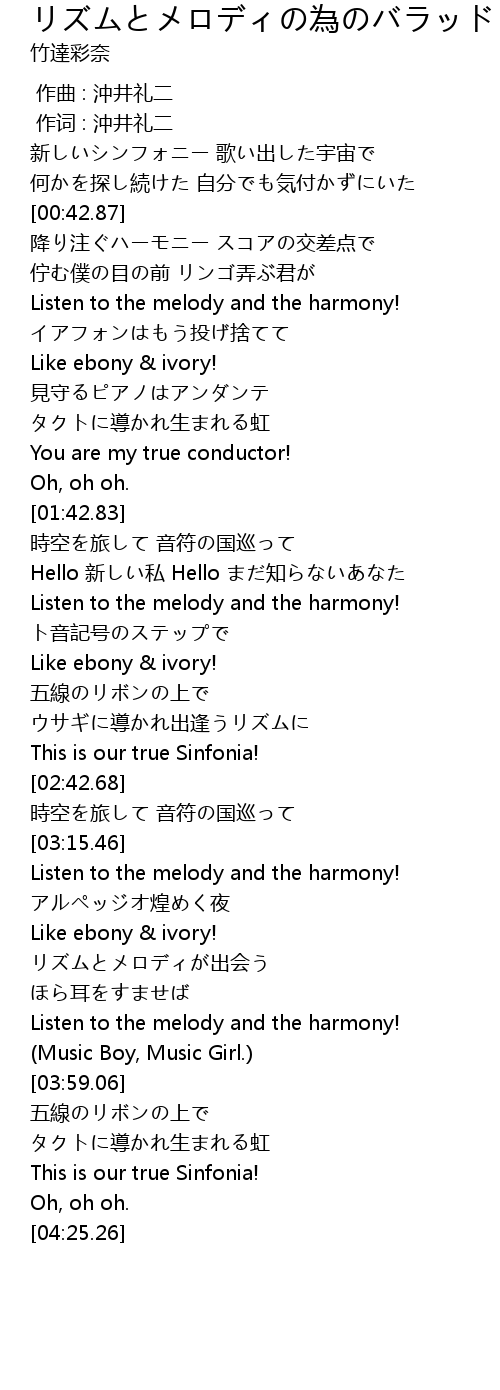 | [00:43.75] | 降り注ぐハーモニー スコアの交差点で |