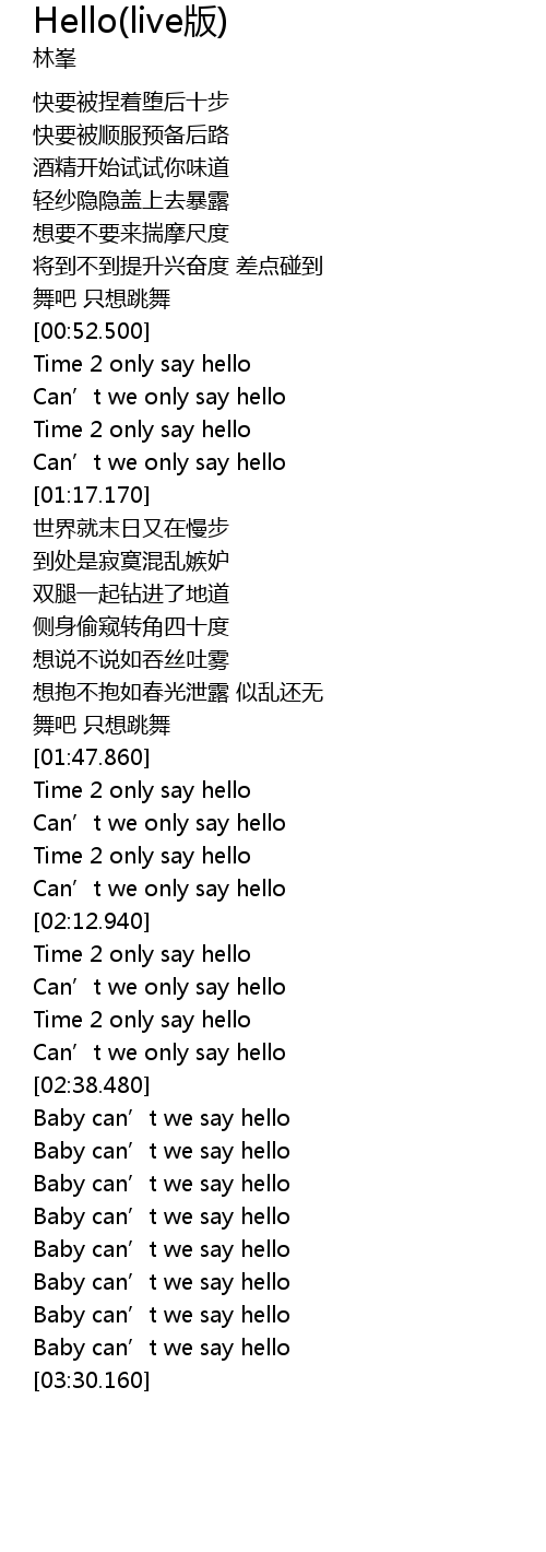 | [02:15.89] | Time 2 only say hello |