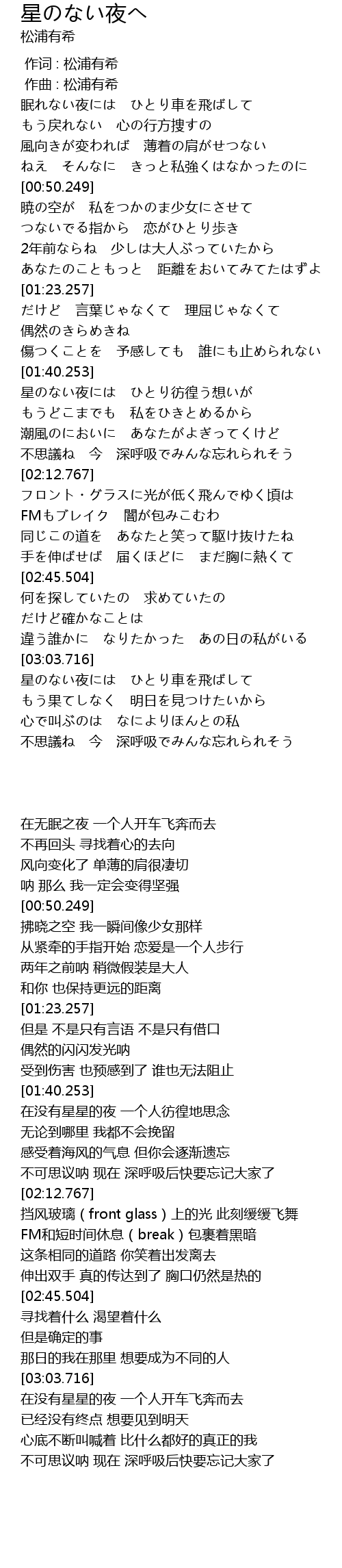 | [03:43.980] | 星のない夜には ひとり車を飛ばして |