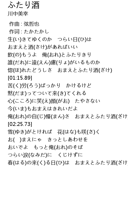 | [02:14.01] | 俺(おれ)の自(じ)慢(まん)さ おまえとふたり酒(ざけ) |
