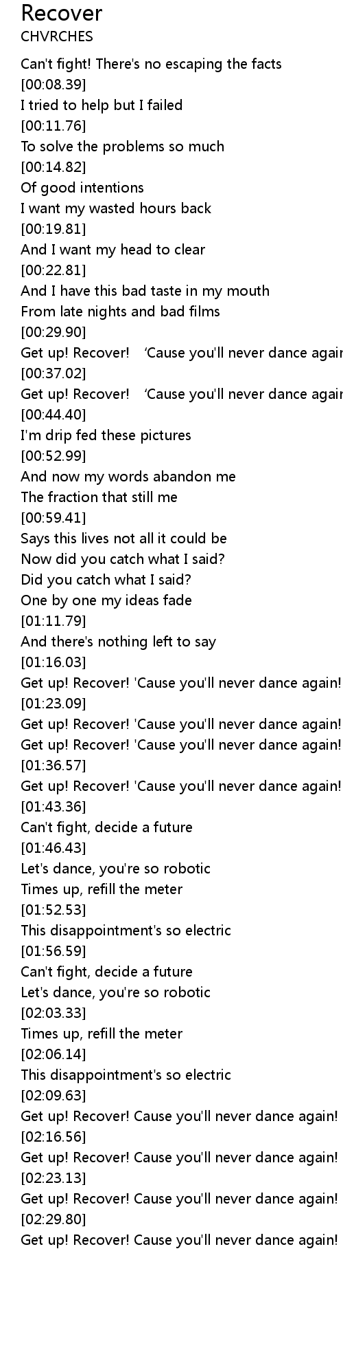 | [02:23.94] | Get up! Recover! Cause you'll never dance again! |