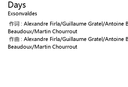 | [00:00.000] | zuo qu : Alexandre Firla Guillaume Gratel Antoine Bernard Simon Beaudoux Martin Chourrout |