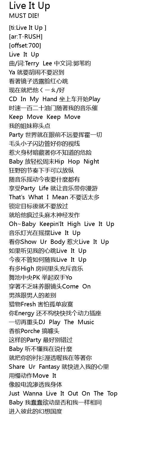 | [01:14.836] | yin yue deng guang zai yao bai Live It Up |