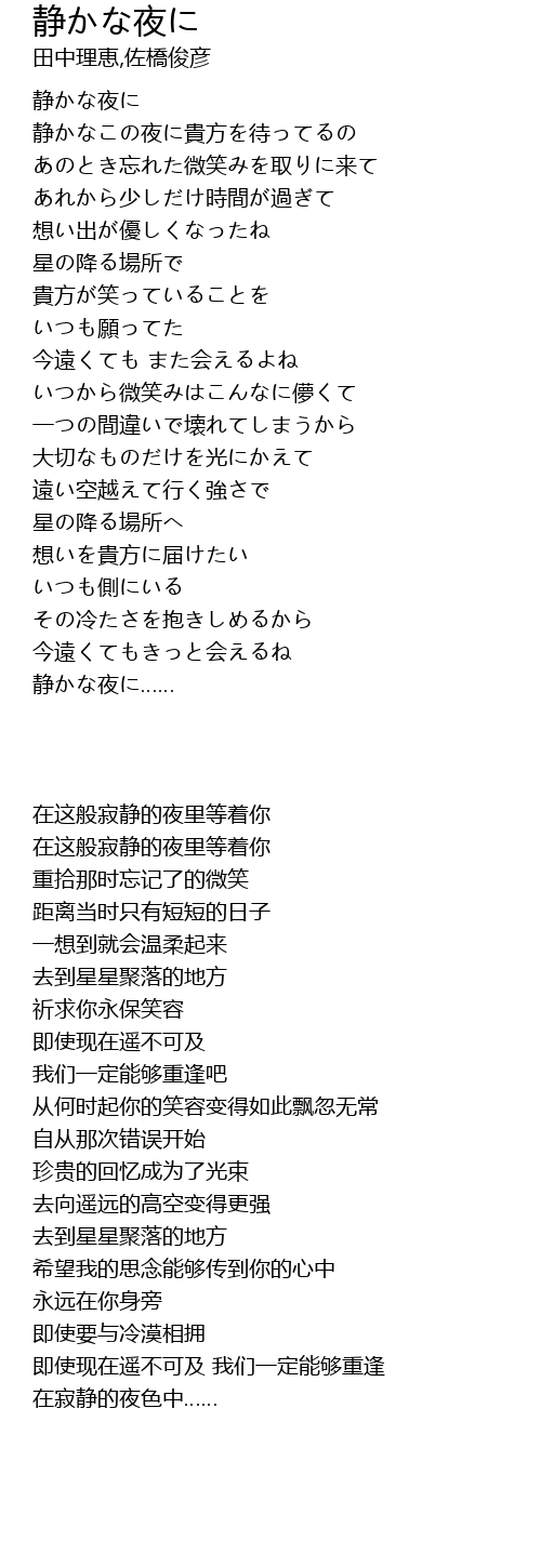| [00:00:00]静かな夜に [00:17.140] | 静かなこの夜に貴方を待ってるの |