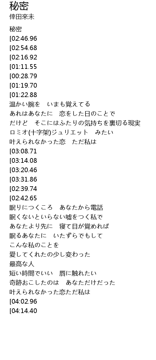 | [00:11.14][02:16.92][03:36.92][03:59.74] | 許されない秘密だとしても |