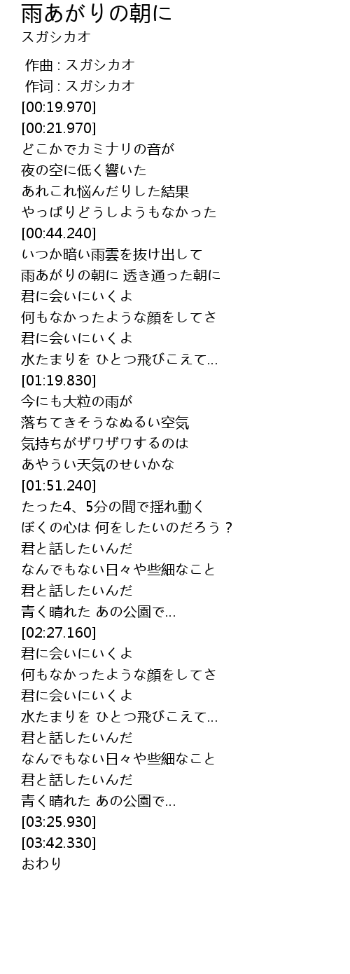 | [00:50.760] | 雨あがりの朝に 透き通った朝に |