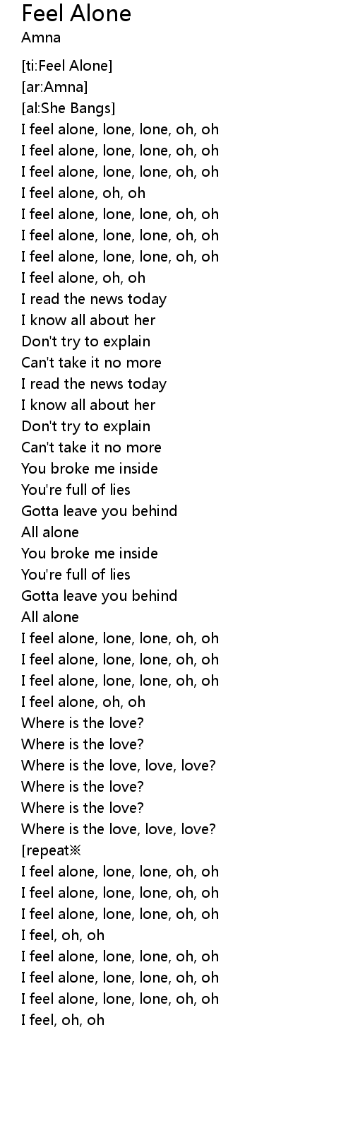 | [03:00.13] | I feel alone, lone, lone, oh, oh |