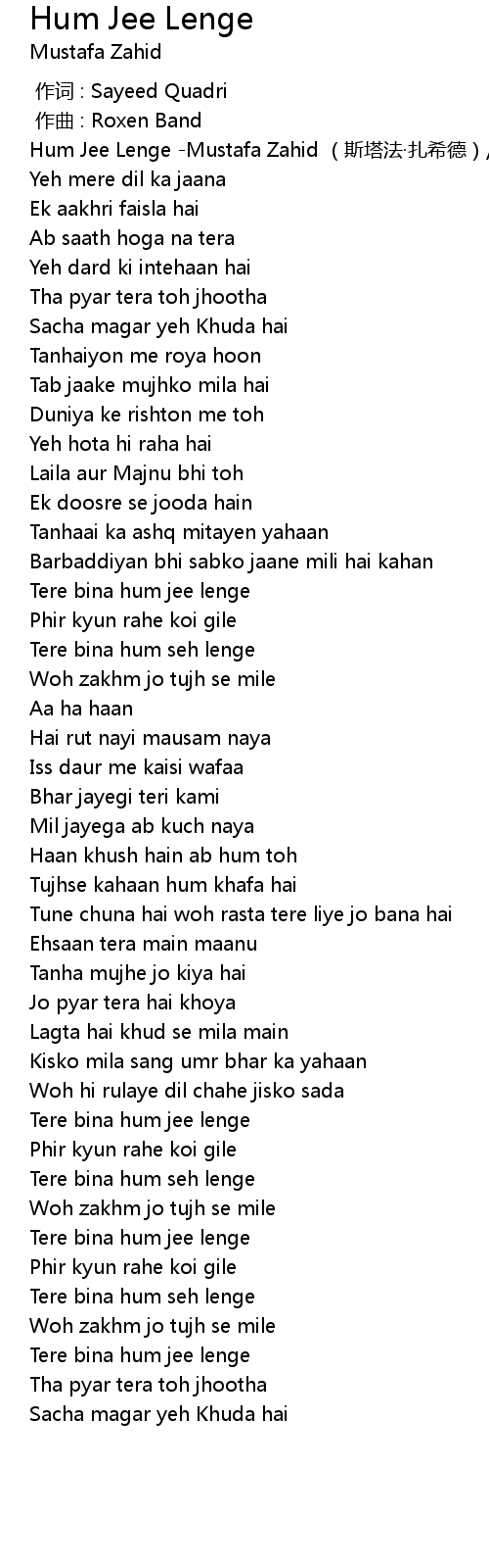 | [00:00.00] | Hum Jee Lenge -Mustafa Zahid (斯塔法·扎希德)/Roxen Band |
