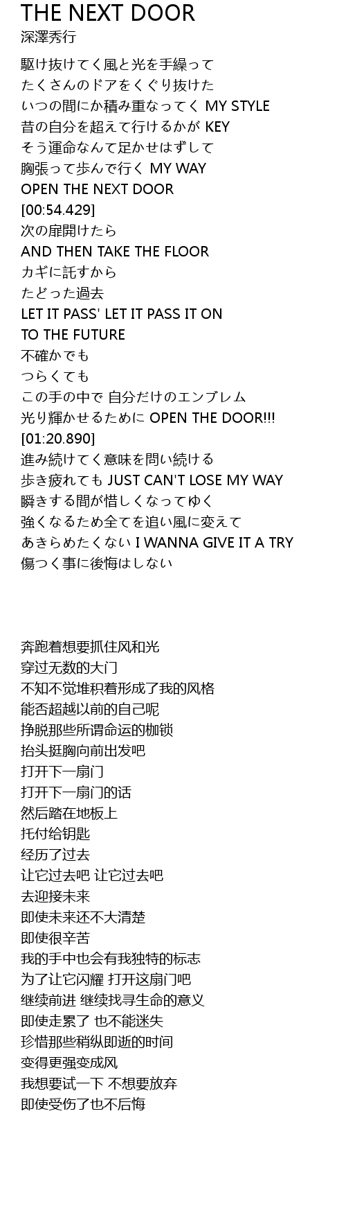| [00:54.189] | OPEN THE NEXT DOOR |