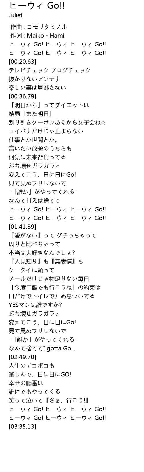 | [03:30.76] | ヒーウィ Go! ヒーウィ ヒーウィ Go!! |
