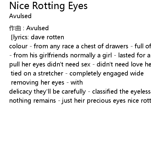 | [music: cabra 3/99] [lyrics: dave rotten] a fascination - for human eyes of any colour - from any race a chest of drawers - full of dried eyes that he collected - from his girlfriends normally a girl - lasted for a week just time enough - to pull her eyes didn't need sex - didn't need love her pretty eyes - his best treasure nice rotting eyes <i>[x4] tied on a stretcher - completely engaged wide open eyelids - dilated pupils nice rotting eyes <i>[x4] removing her eyes - with delicacy they'll be carefully - classified the eyeless corpses - were carbonized nothing remains - just heir precious eyes nice rotting eyes <i>[x4] |