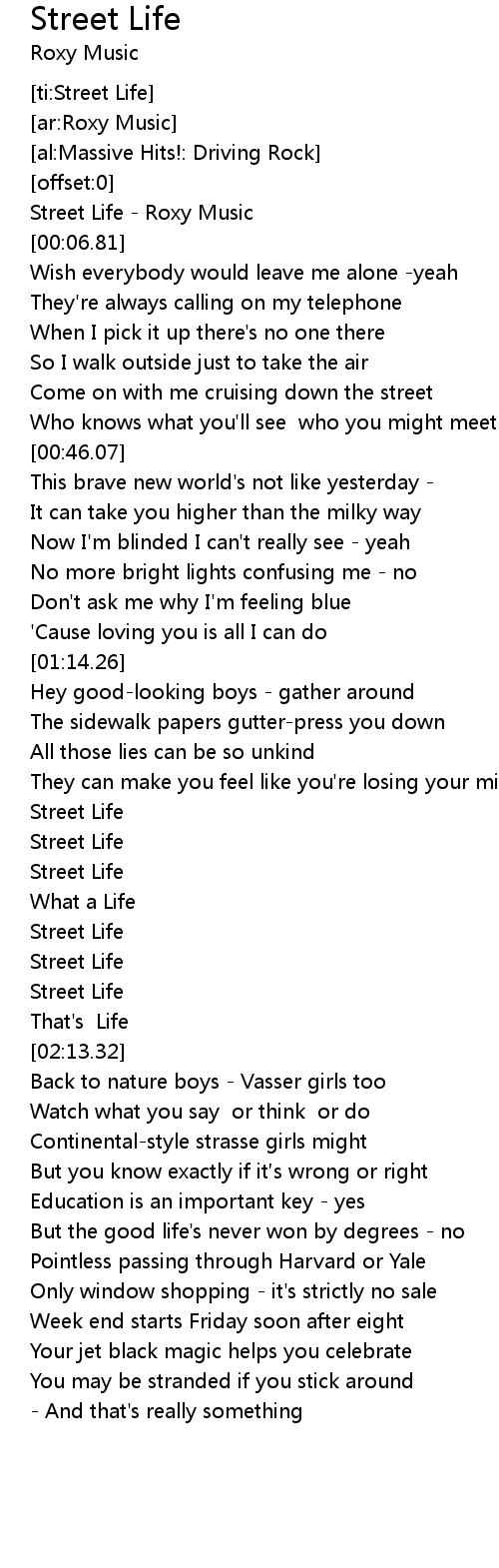 | [00:01.29] | Street Life Roxy Music |