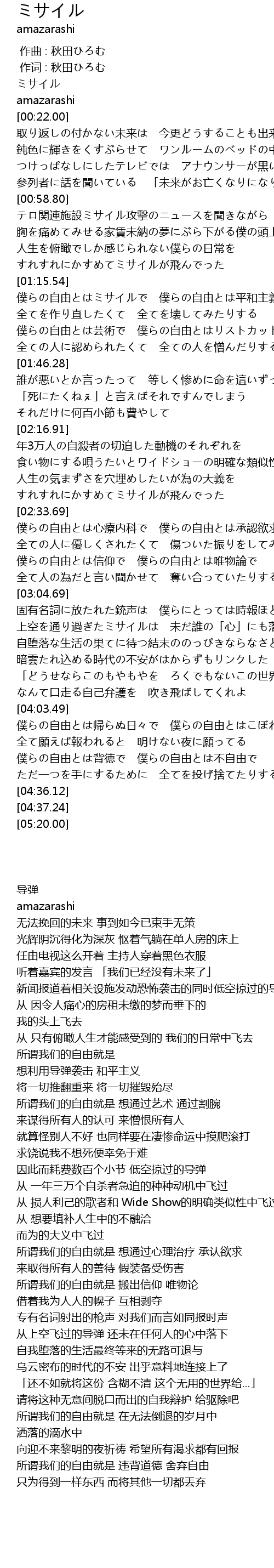 | [01:16.07] | 僕らの自由とはミサイルで 僕らの自由とは平和主義で |