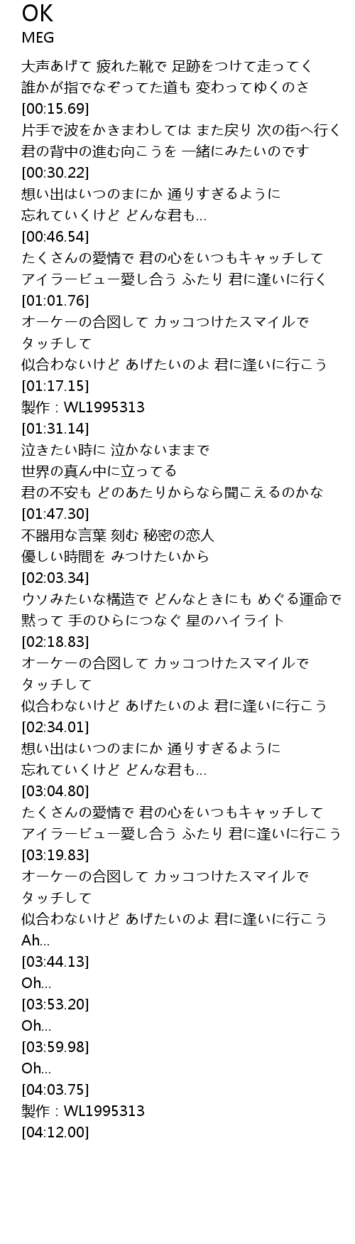| [03:20.78] | オーケーの合図して カッコつけたスマイルで タッチして |