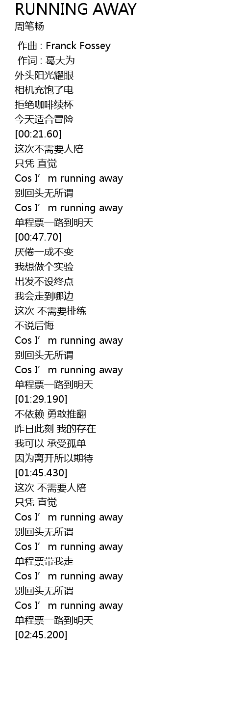 | [02:18.440] | Cos I’m running away |