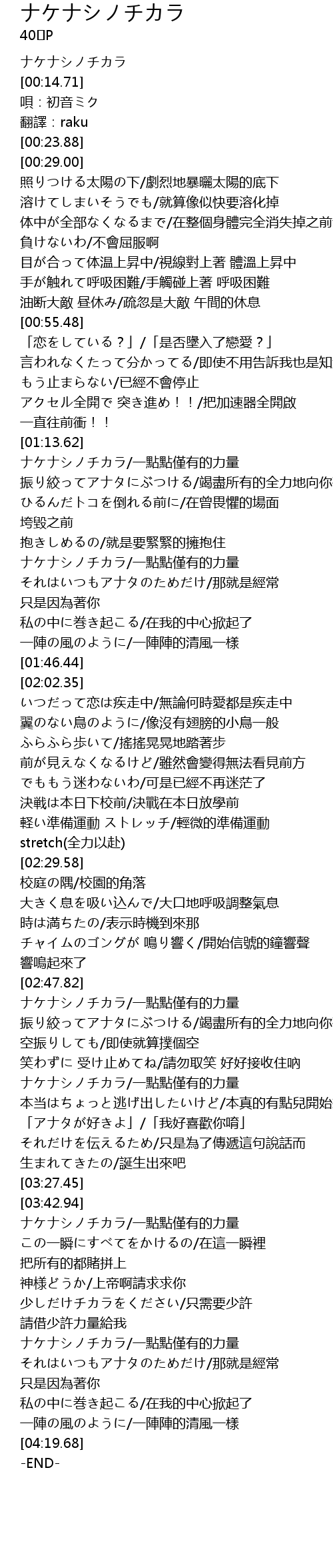 | [03:59.61] | ナケナシノチカラ/一點點僅有的力量 |