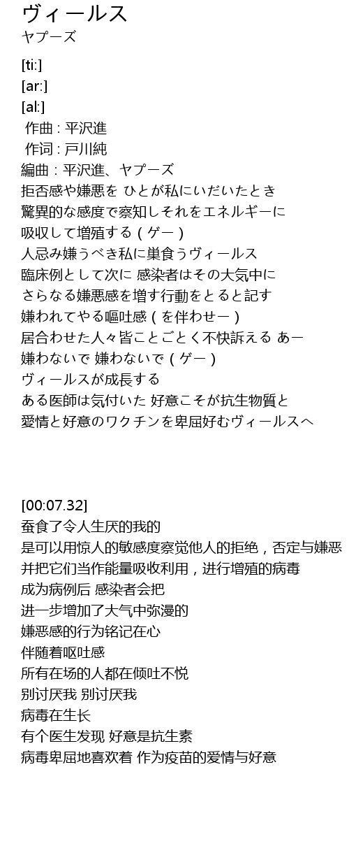 | [02:35.22] | 病毒卑屈地喜欢着 作为疫苗的爱情与好意 |