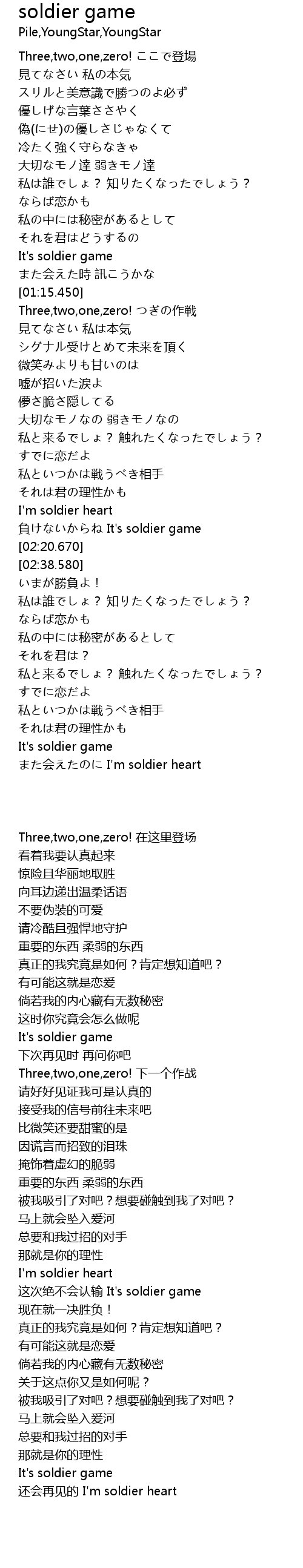 | [02:15.890] | 这次绝不会认输 It's soldier game |