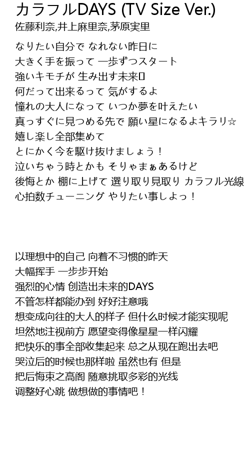 | [00:49.03] | 真っすぐに見つめる先で 願い星になるよキラリ☆ |