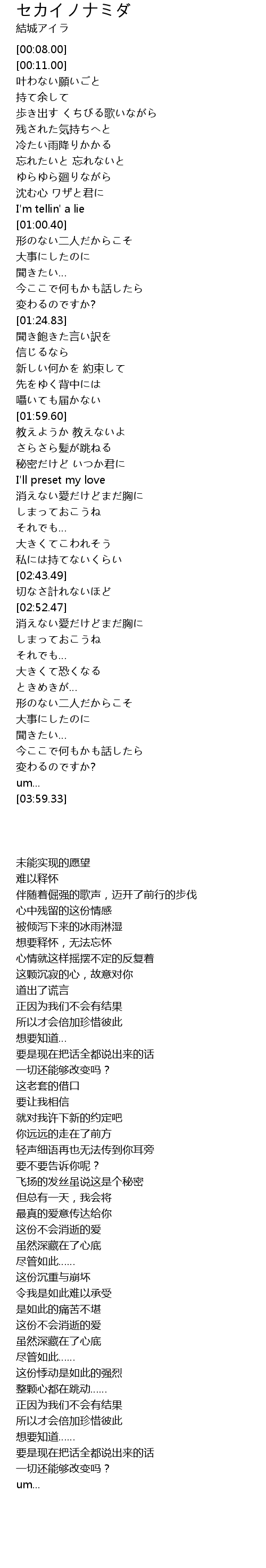 | [02:19.39] | 消えない愛だけどまだ胸に |