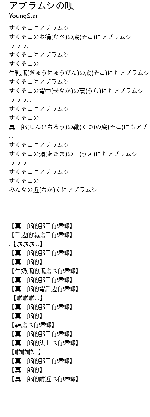 | [00:09.62] | すぐそこのお鍋(なべ)の底(そこ)にアブラムシ |